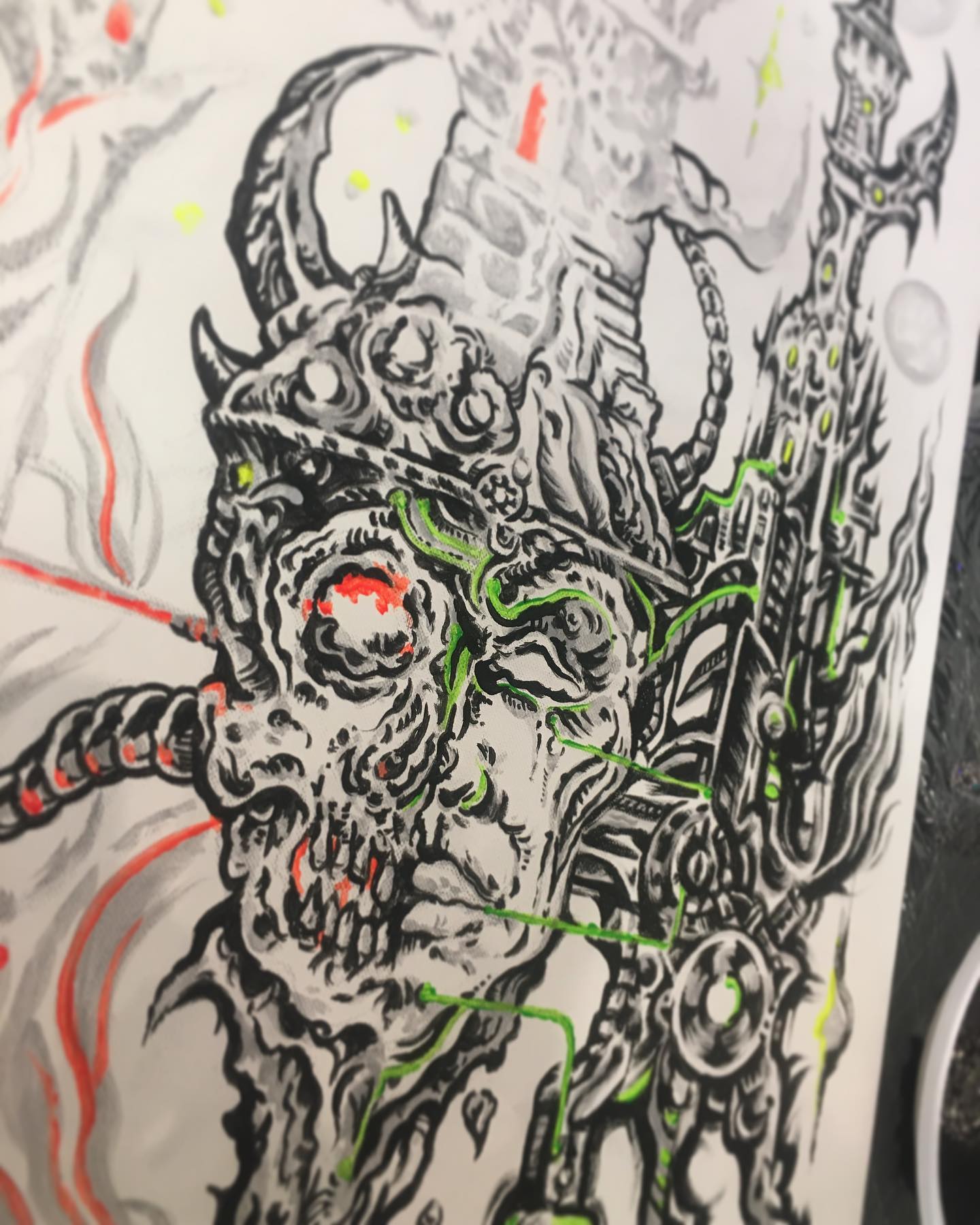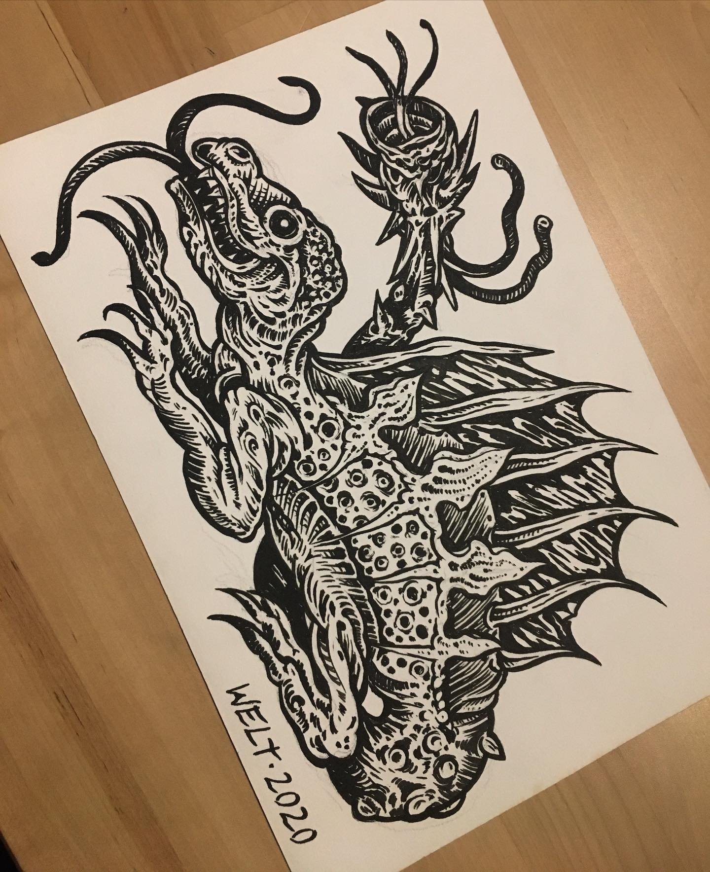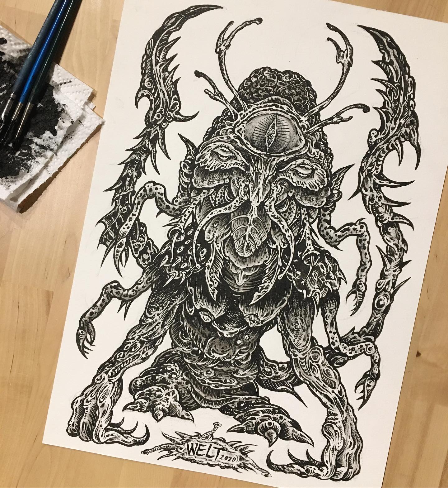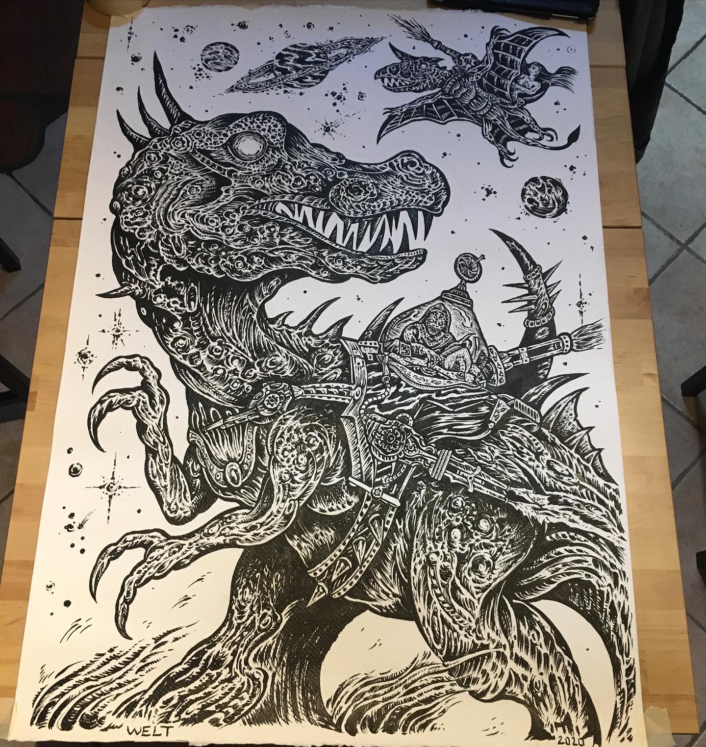 Welt also creates works adaptable to merchandise of various kinds, selling both original art and only print files (for T Shirts, Bags, Logos, posters, etc). In addition to the private client, his artistic production has also been used by the likes of Slayer, Autopsy, Profondo Rosso Store, Saint Vitus, Goblin Claudio Simonetti and many others.